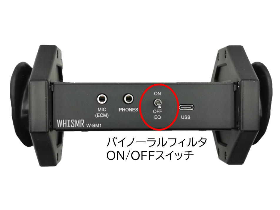 WHISMR〈ウイスマー〉W-BM1では、録音時に周波数特性を補正するバイノーラル補正フィルタ機能を搭載しています。例えば、配信など、聴き手の環境がヘッドホンだけとは限らない用途では、バイノーラル補正フィルタをONにする事で、スピーカーで聞いても違和感のない自然な特性で再生する事ができます。