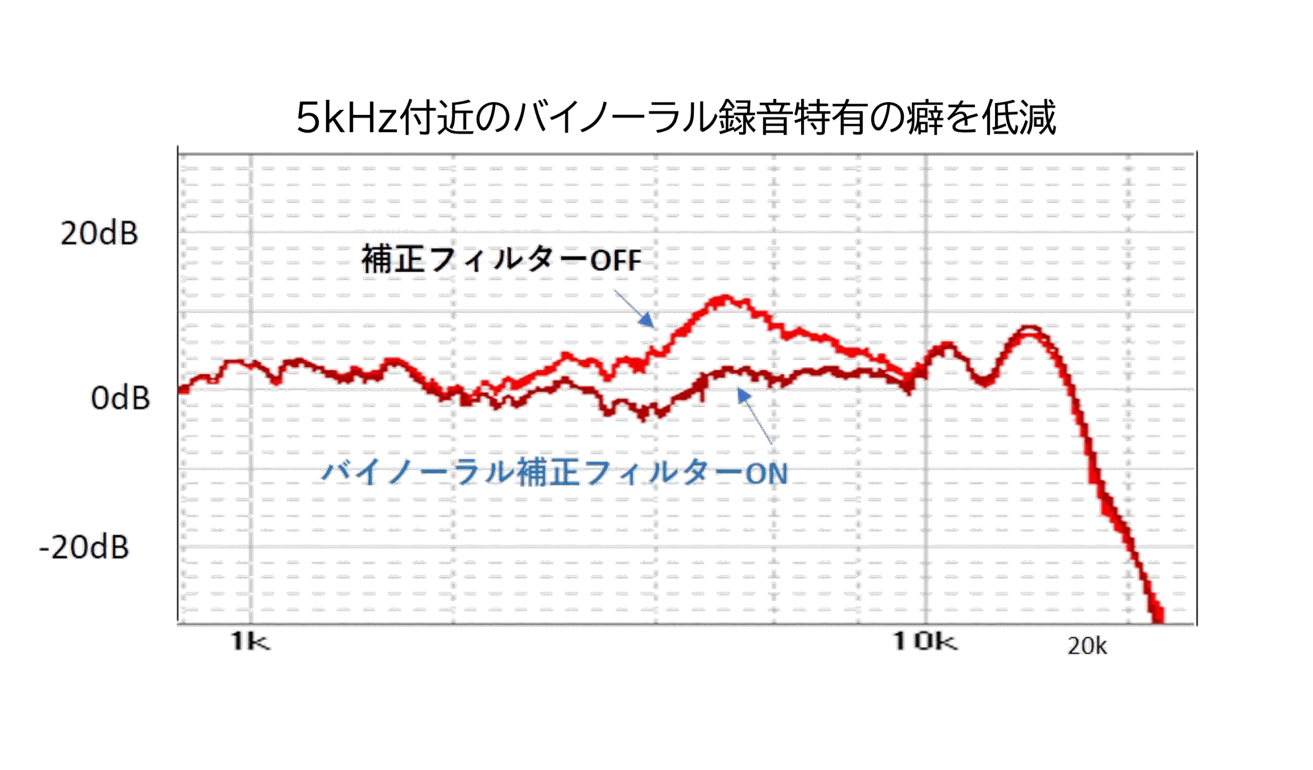 一方青いラインは著名な業務用ダミーヘッドのデータで、このピークがイコライジングにより補正されている事が判ります。